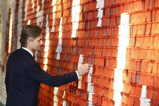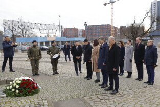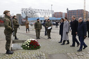 Gdańsk. Forum Kościuszkowskie. Nz. Złożenie kwiatów pod pomnikiem Poległych Stoczniowców 1970.