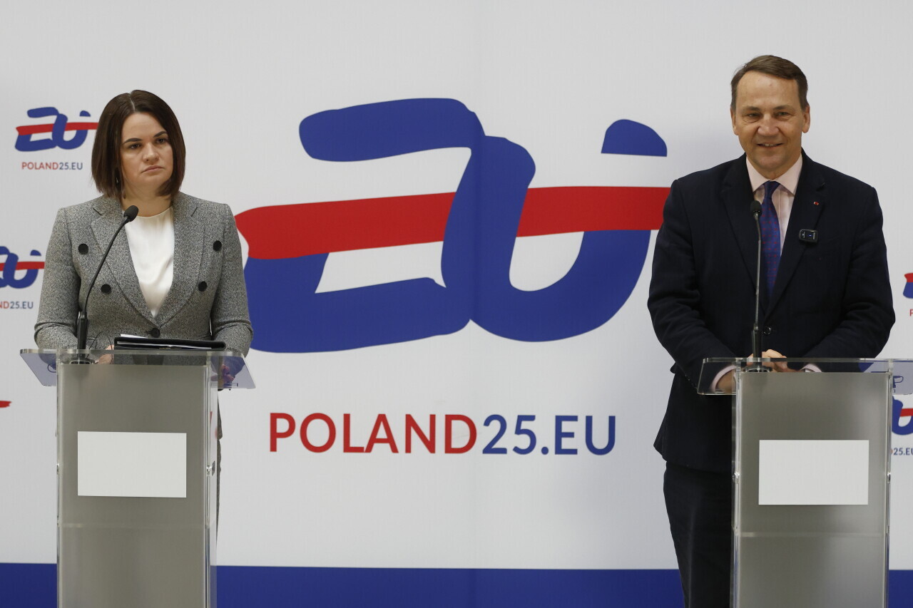 Gdańsk. Forum Kościuszkowskie. Nz. Konferencja prasowa: Radosław Sikorski - minister spraw zagranicznych, Swiatłana Cichanouska - białoruska aktywistka praw człowieka.
