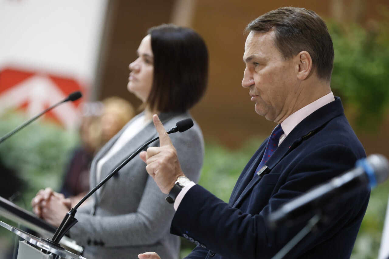 Gdańsk. Forum Kościuszkowskie. Nz. Konferencja prasowa: Radosław Sikorski - minister spraw zagranicznych, Swiatłana Cichanouska - białoruska aktywistka praw człowieka.