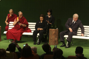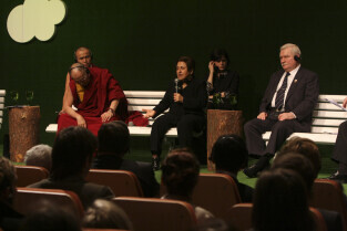 Forum Młodych w ramach obchodów 25-lecia otrzymania przez Lecha Wałęsę Pokojowej Nagrody Nobla. Nz. Dalajlama XIV, Shrin Ebadi (laureat Pokojowej Nagrody Nobla), Lech Wałęsa (B. Prezydent RP)