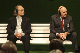 Forum Młodych w ramach obchodów 25-lecia otrzymania przez Lecha Wałęsę Pokojowej Nagrody Nobla. Nz. od lewej: Adolfo Perez Esquivel (laureat Pokojowej Nagrody Nobla), Frederik Willem De Klerk (B. Prezydent RPA)