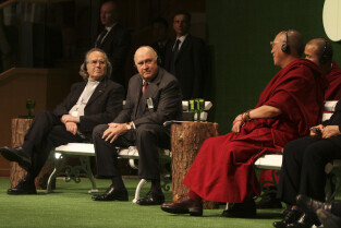 Forum Młodych w ramach obchodów 25-lecia otrzymania przez Lecha Wałęsę Pokojowej Nagrody Nobla. Nz. od lewej: Adolfo Perez Esquivel (laureat Pokojowej Nagrody Nobla), Frederik Willem De Klerk (B. Prezydent RPA), Dalajlama XIV