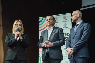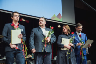 Gdańsk, ECS. GDAŃSKA NAGRODA RÓWNOŚCI im. Pawła Adamowicza. Nz. Magdalena Adamowicz, dyrektor ECS Basil Kerski i wiceprezydent Gdańska Alan Aleksandrowicz