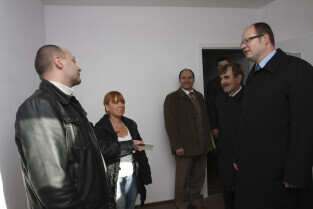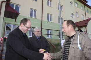 Oddanie do użytku budynków GTBS na Ujeścisku, dzielnicy Gdańska. Nz. Prezydent Gdańska Paweł Adamowicz wręcza klucze do nowego mieszkania Leszkowi Blanikowi