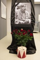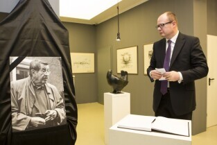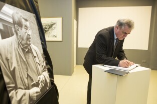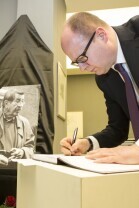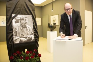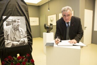 Gdańska Galeria Güntera Grassa. Księga kondolencyjna wyłożona w związku ze śmierci pisarza Güntera Grassa. Nz. wpisu dokonuje Przewodniczący Rady Miasta Gdańska Bogdan Oleszek