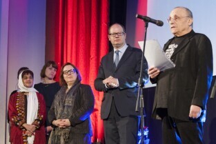 Gala wręczenia nagród podczas Gdańsk DocFilm Festival. Gdańsk, Kino Neptun. Nz. od prawej: Marcel Łoziński (Przewodniczący Jury), Prezydent Gdańska Paweł Adamowicz, członkowie Jury Dorota M. Paciarelli i Katayoon Shahabi