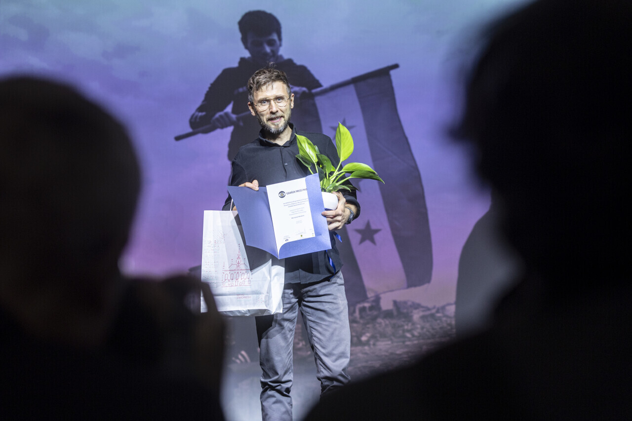 Gdańsk. W Centrum św. Jana odbyła się gala wręczenia nagród w XXIX Konkursie Fotografii Prasowej Gdańsk Press Photo. Nz. Maciej Moskwa
