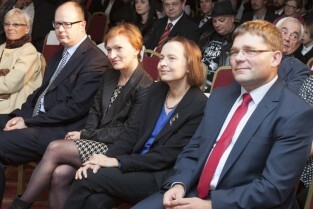 Gala Projektu Mistrzowie, w ramach którego powstał kalendarz z fotografiami przedstawiających 12 Mistrzów z terenu Pomorza. Zysk ze sprzedaży trafi do Gdańskiej Fundacji Innowacji Społecznych. Sopot, Hotel Haffner. Nz. od lewej: Prezydent Gdańska Paweł Adamowicz, Prezes GFIS Marianna Sitek-Wróblewska, Posłanka na Sejm RP Katarzyna Hall, członek zarządu GFIS Piotr Wróblewski