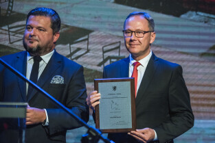 Gdańsk, ul. Elektryków. Gala Rozdania Nagród Smart Metropolia. Nz. Członek Zarządu Woj. Pomorskiego Piotr Orłowski i Janusz Stankowiak prezydent Starogardu Gdańskiego