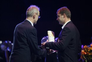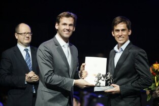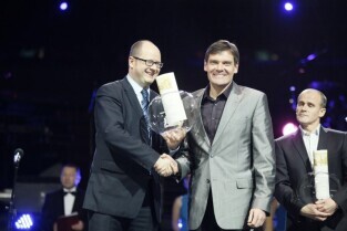 Gdańska Gala Sportu 2010. Ergo Arena na granicy Gdańska i Sopotu. Nz. "Sportowiec Roku 2010" Piotr Myszka, nagrodę wręcza Mateusz Kusznierewicz