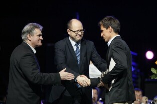 Gdańska Gala Sportu 2010. Ergo Arena na granicy Gdańska i Sopotu. Nz. 1-sza dzięsiątka w kategorii "Sportowiec Roku", miejsce III Adam Korol (wręcza Prezydent Gdanska Paweł Adamowicz)
