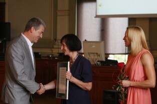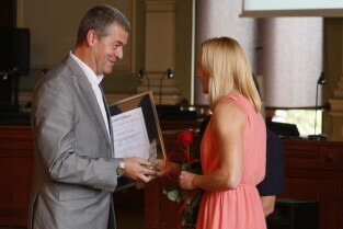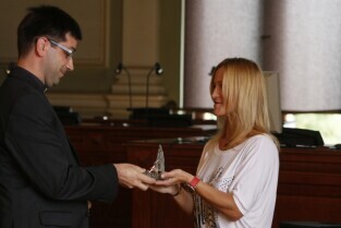 Gala finałowa regionalnego pomorskiego Konkursu Lodołamaczy 2012, podczas której nagrodzeni zostali pracodawcy zatrudniający osoby niepełnosprawne. Nz. lekkoatletka Anna Rogowska wręcza nagrodę Superlodołamacz 2012, którą otrzymuje: Stowarzyszenie Rehabilitacyjno-Sportowe "Szansa-Start Gdańsk", a odbiera Prezes Eugeniusz Grabowski