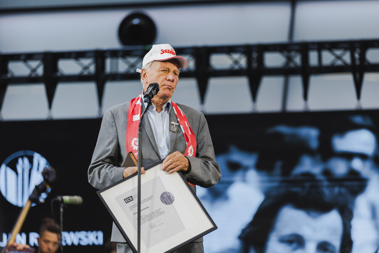 Gdańsk, ECS. Gala wręczenia Odznaki Solidarności i Praw Człowieka ECS, które w tym roku otrzymają Piotr Adamowicz, Bożena Grzywaczewska, Maciej Grzywaczewski, Ewa Kulik-Bielińska, Bogdan Lis, Jan Rulewski, Sławomir Rybicki, Jacek Taylor, Krystyna Zachwatowicz-Wajda.