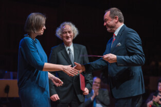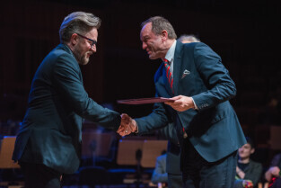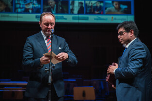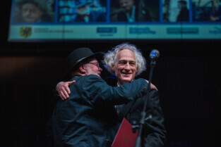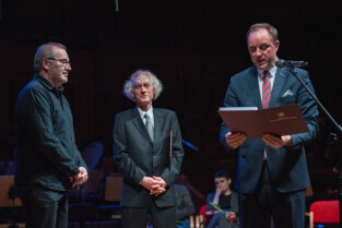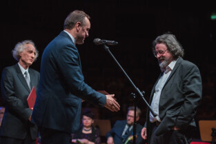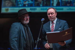 Gdańsk. Filharmonia Bałtycka ul. Ołowianka. Gala wręczenia Pomorskiej Nagrody Artystycznej 2016. Nz. Paweł Huelle i Marszałek Województwa Pomorskiego Mieczysław Struk