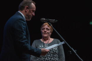 Gdańsk. Filharmonia Bałtycka ul. Ołowianka. Gala wręczenia Pomorskiej Nagrody Artystycznej 2016. Nz. Marszałek Województwa Pomorskiego Mieczysław Struk i Elżbieta Bernacka Hanus