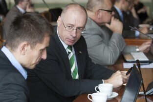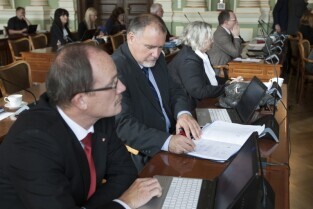 Sesja Rady Miasta Gdańska poświęcona Strategii Rozwoju Gdańska 2030 Plus. Gdańsk, Nowy Ratusz. Nz. od lewej Radni Miasta Gdańska Jaromir Falandysz i Kazimierz Koralewski
