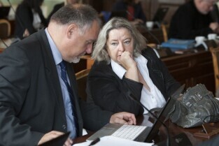 Sesja Rady Miasta Gdańska poświęcona Strategii Rozwoju Gdańska 2030 Plus. Gdańsk, Nowy Ratusz. Nz. Radni Miasta Gdańska Jolanta Banach i Piotr Gierszewski