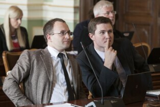 Sesja Rady Miasta Gdańska poświęcona Strategii Rozwoju Gdańska 2030 Plus. Gdańsk, Nowy Ratusz. Nz. od lewej: Radni Miasta Gdańska Marcin Skwierawski i Piotr Grzelak