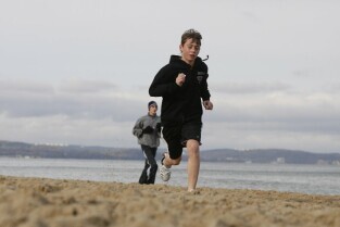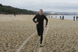 II edycja sportowej imprezy "Gdańsk Biega" na plaży w Brzeźnie. Nz. Mateusz Czaja, który jako pierwszy przybiegł na metę