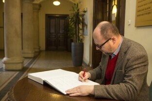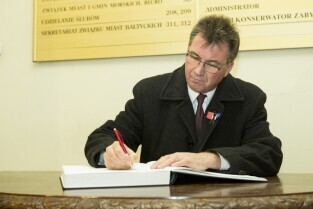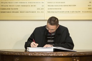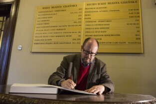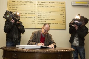 Gdańsk, Nowy Ratusz. Księga kondolencyjna wyłożona w celu uczczenia ofiar zamachów w Paryżu. Nz. Prezydent Gdańska Paweł Adamowicz