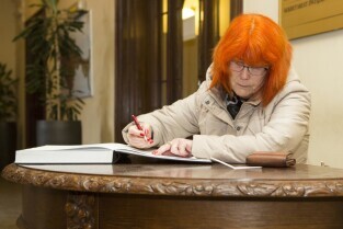 Gdańsk, Nowy Ratusz. Księga kondolencyjna wyłożona w celu uczczenia ofiar zamachów w Paryżu. Nz. Konsul honorowa Francji w Gdańsku Monika Tarnowska