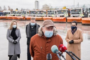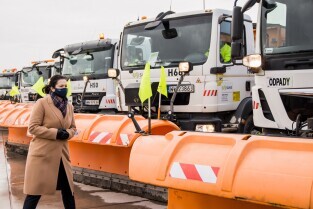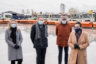 Gdańsk gotowy na nadejście zimy. Briefing prasowy dotyczący utrzymania zimowego. W briefingu udział wzięli Aleksandra Dulkiewicz, prezydent Gdańska, Piotr Grzelak, z-ca prezydent Gdańska ds. zrównoważonego rozwoju, Mariusz Bogusz, prezes SUEZ Północ Sp. z o.o., Mieczysław Kotłowski, dyrektor Gdańskiego Zarządu Dróg i Zieleni