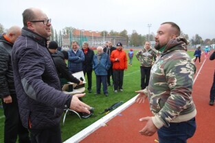 Gdańsk. Gdański Ośrodek Kultury Fizycznej, otwarcie nowego stadionu lekkoatletycznego. Nz Prezydent Gdańska Paweł Adamowicz i Sławomir Kaszuba-zawodnik Lechii Gdańsk.