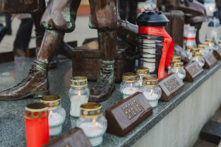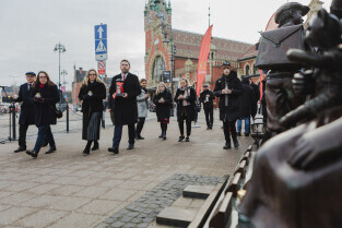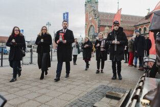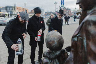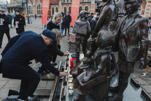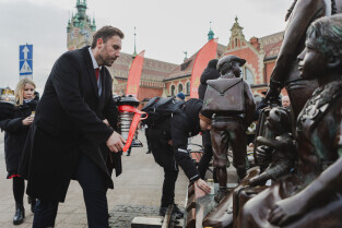 Gdańsk, przy Pomniku Kindertransportów. Gdańsk uczcił ofiary Holocaustu. Hołd ofiarom Holocaustu złożyła delegacja miasta. Radni - Andrzej Kowalczys, Kamila Błaszczyk, Agnieszka Owczarczak (przewodnicząca Rady Miasta Gdańska), Piotr Borawski - zastępca prezydenta Gdańska, radna sejmiku pomorskiego Beata Dunajewska, radna miasta Katarzyna Czerniewska