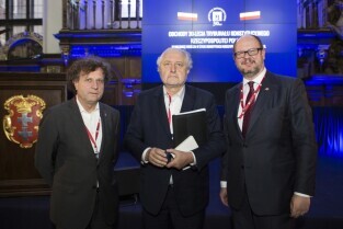 Gdańsk, Dwór Artusa. Obchody 30-lecia Trybunału Konstytucyjnego. Nz. od lewej: Prezydent Sopotu Jacek Karnowski, Prezes Trybunału Konstytucyjne prof. Andrzej Rzepliński, Prezydent Gdańska Paweł Adamowicz