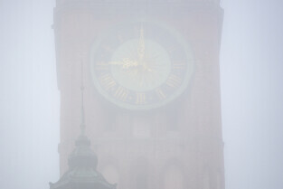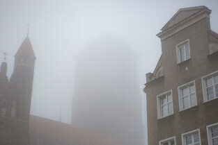 Gdańsk spowity w jesiennej mgle. Na zdjęciu wieża Ratusza Głównego Miasta
