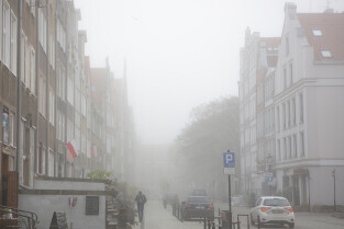 Gdańsk spowity w jesiennej mgle. Na zdjęciu ulica Świętego Ducha