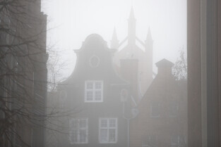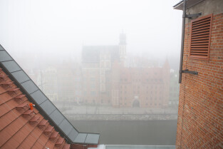 Gdańsk spowity w jesiennej mgle. Na zdjęciu północny szczyt Dworu Artusa