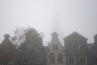 Gdańsk spowity w jesiennej mgle. Na zdjęciu kamienice przy ul. Chlebnickiej, w tle wieża Ratusza Głównego Miasta