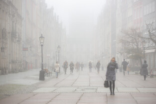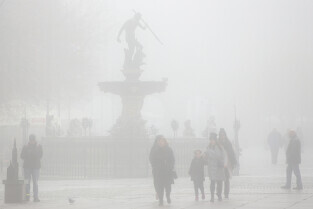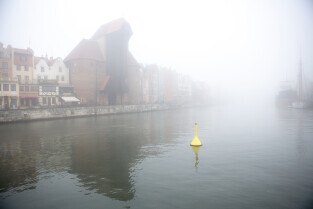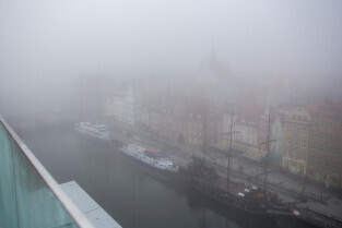 Gdańsk spowity w jesiennej mgle. Na zdjęciu Długie Pobrzeże
