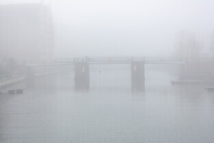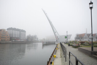 Gdańsk spowity w jesiennej mgle. Na zdjęciu Most Krowi