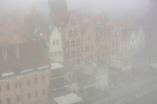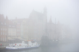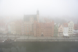 Gdańsk spowity w jesiennej mgle. Na zdjęciu Długie i Rybackie Pobrzeże