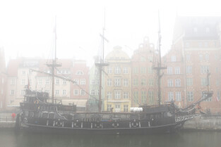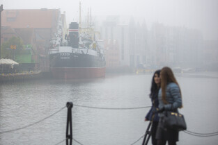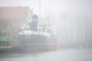 Gdańsk spowity w jesiennej mgle. Na zdjęciu statek muzeum Sołdek