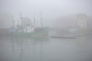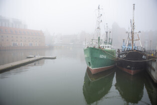 Gdańsk spowity w jesiennej mgle. Na zdjęciu kutry zacumowane przy Wyspie Ołowianka