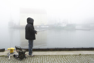 Gdańsk spowity w jesiennej mgle. Na zdjęciu wędkarz na północnym cyplu Wyspy Spichrzów