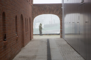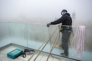 Gdańsk spowity w jesiennej mgle. Na zdjęciu alpinista na dachu Solnego Spichlerza, restauracja Roof Top by SASSY