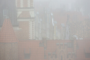 Gdańsk spowity w jesiennej mgle. Na zdjęciu szczyty kamienic przy ulicy Mariackiej