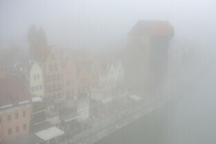 Gdańsk spowity w jesiennej mgle. Na zdjęciu Żuraw i Długie Pobrzeże