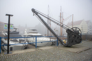 Gdańsk spowity w jesiennej mgle. Na zdjęciu kutry zacumowane przy Wyspie Ołowianka oraz Most Kamieniarski