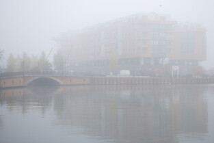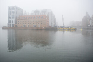Gdańsk spowity w jesiennej mgle. Na zdjęciu Wyspa Spichrzów