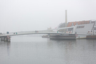 Gdańsk spowity w jesiennej mgle. Na zdjęciu kładka na Wyspę Ołowiankę