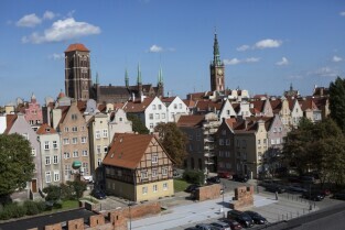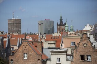 Biurowiec Organika i Hotel Heweliusz Mercure oraz wieża Kościoła Św. Katarzyny. Widok z dachu Teatru Szekspirowskiego