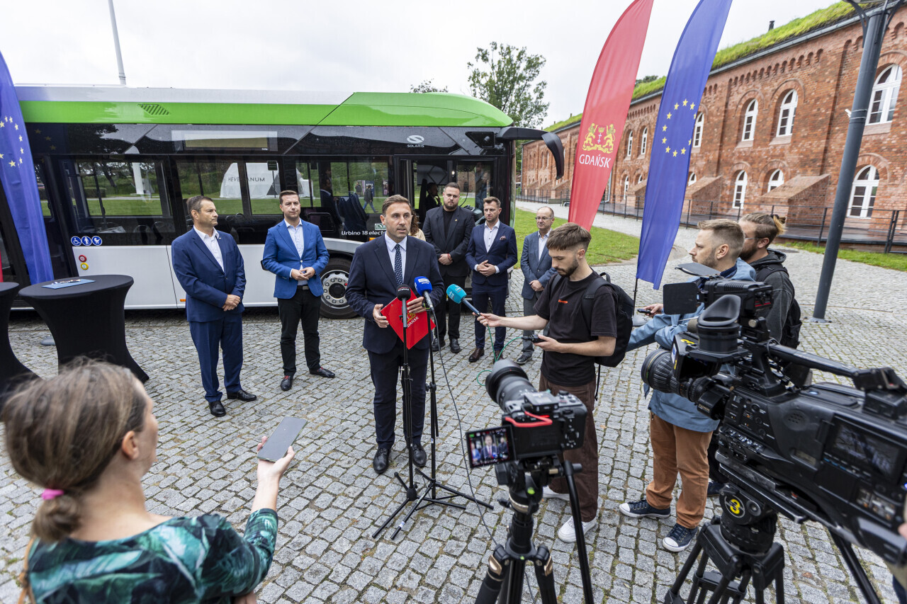 Gdańsk. Prezydenta Aleksandra Dulkiewicz i Andrzej Sienkiewicz, Sales Director Poland Solaris Bus & Coach w obecności wiceprezydenta Piotra Borawskiego, radnych Cezarego Śpiewak-Dowbór i Marcina Makowskiego, Łukasza Kłosa, Prezesa Zarządu Transportu Miejskiego oraz Macieja Lisickiego, Prezesa GAiT podpisali umową na dostawę 30 elektrycznych autobusów miejskich marki Solaris.