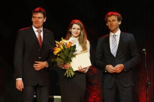 Gdańska Gala Sportu, podczas której nagrodzono wybitnych sportowców za ich osiągnięcia. Gdańsk, Filharmonia Bałtycka. Nz. nagroda "Sportowiec Roku 2011" - Zuzanna Pawlikowska, którą wręczyli Przewodniczący Rady Miasta Gdańska Bogdan Oleszek i Przewodniczący Gdańskiej Rady Sportu Wojciech Przybylski