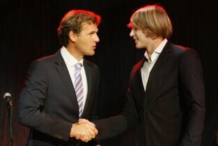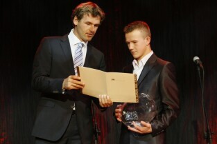Gdańska Gala Sportu, podczas której nagrodzono wybitnych sportowców za ich osiągnięcia. Gdańsk, Filharmonia Bałtycka. Nz. nagroda w kategorii "Sportowe Nadzieje Roku 2011", którą otrzymuje Krystian Pieszczek. Nagrodę wręcza Mateusz Kusznierewicz
