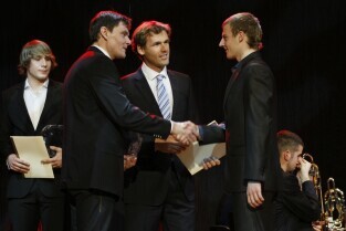 Gdańska Gala Sportu, podczas której nagrodzono wybitnych sportowców za ich osiągnięcia. Gdańsk, Filharmonia Bałtycka. Nz. nagroda w kategorii "Sportowe Nadzieje Roku 2011", którą otrzymuje Wojciech Pawłowski. Nagrodę wręczają Adam Korol i Mateusz Kusznierewicz